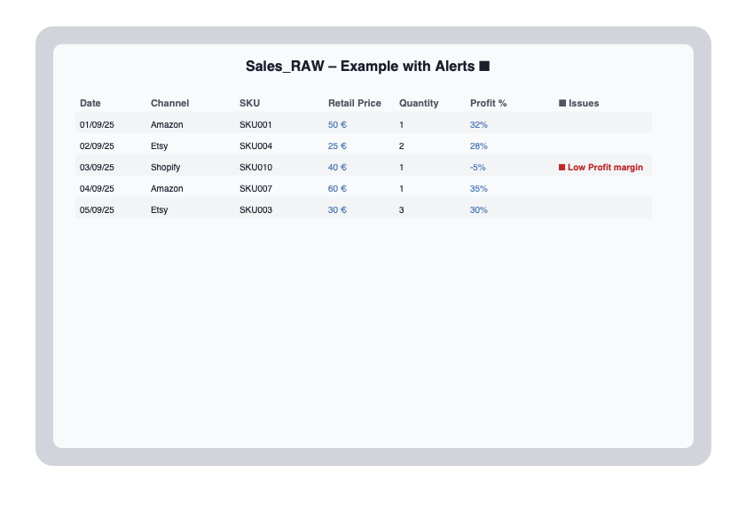 📈 Track by sales channel (Shopify, Etsy, Amazon FBA, Others)
