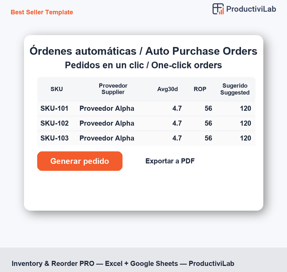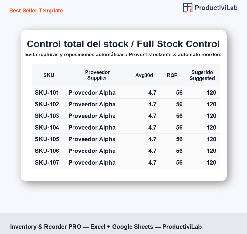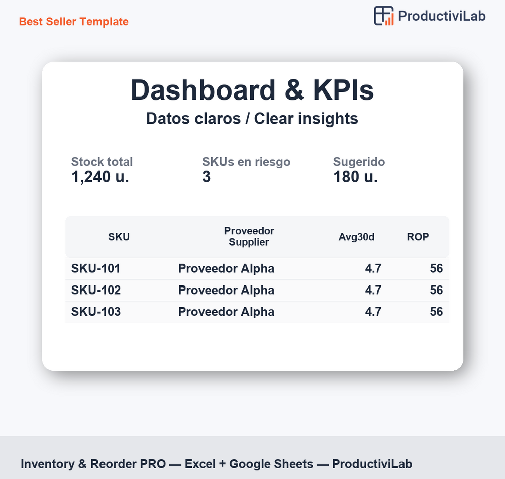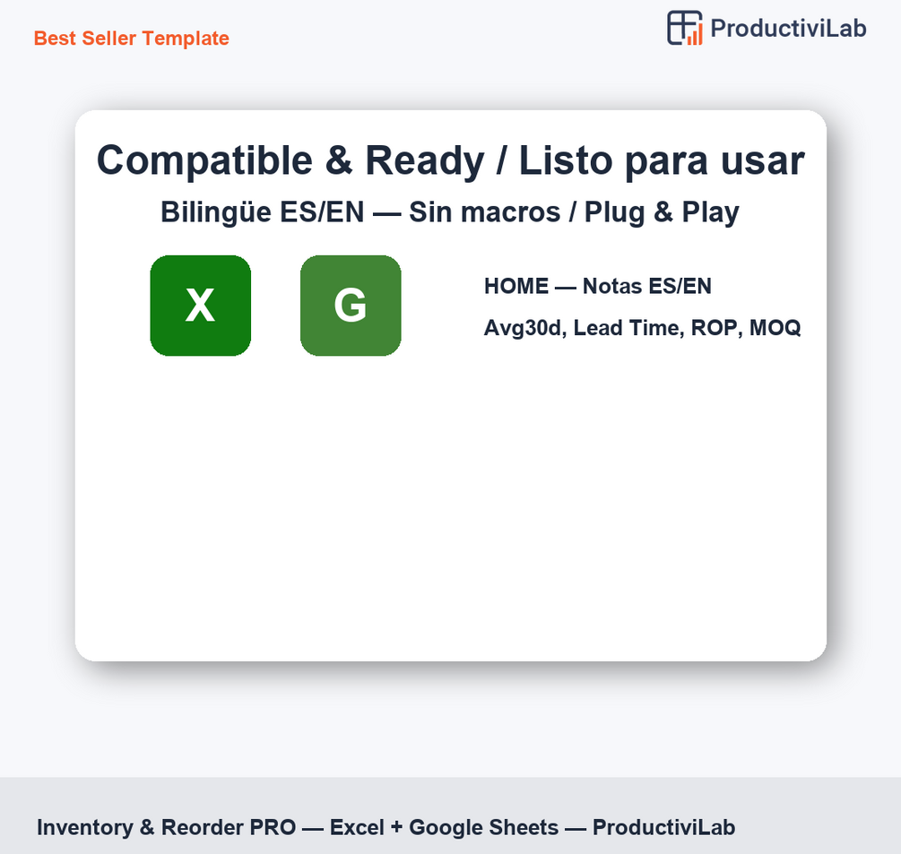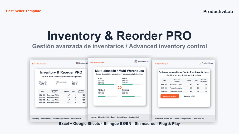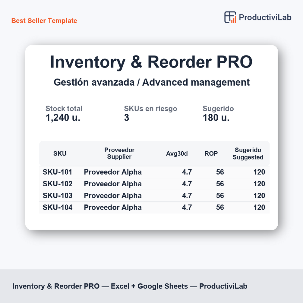 Inventory & Reorder PRO — Excel + Google Sheets Template (ES/EN)